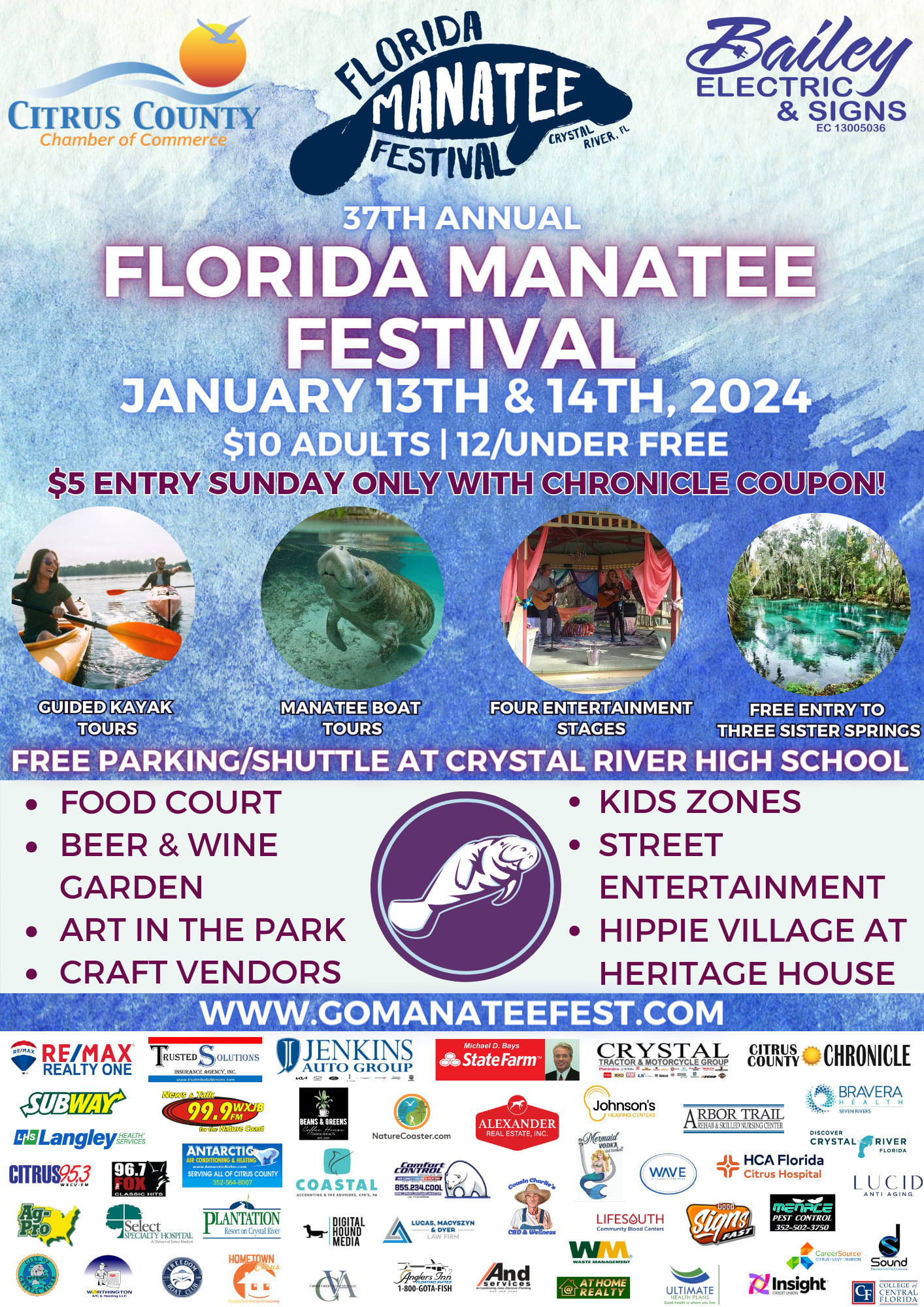 The Florida Manatee Festival returns for its 37th year to the manatee capital of the world, downtown Crystal River, on Saturday and Sunday, January 13th & 14th! Produced by The Citrus County Chamber of Commerce, we are pleased to welcome Bailey Electric & Signs as our presenting sponsor for the third year in a row. Entry is only $10 for adults, age 12 and under are free. Additionally, we are excited to offer a special with our partners at The Citrus County Chronicle. Sunday is Citrus County Day, just pick up a Citrus County Chronicle on your way to the festival and get $5-OFF up to FOUR adult entries with the coupon on the front cover.