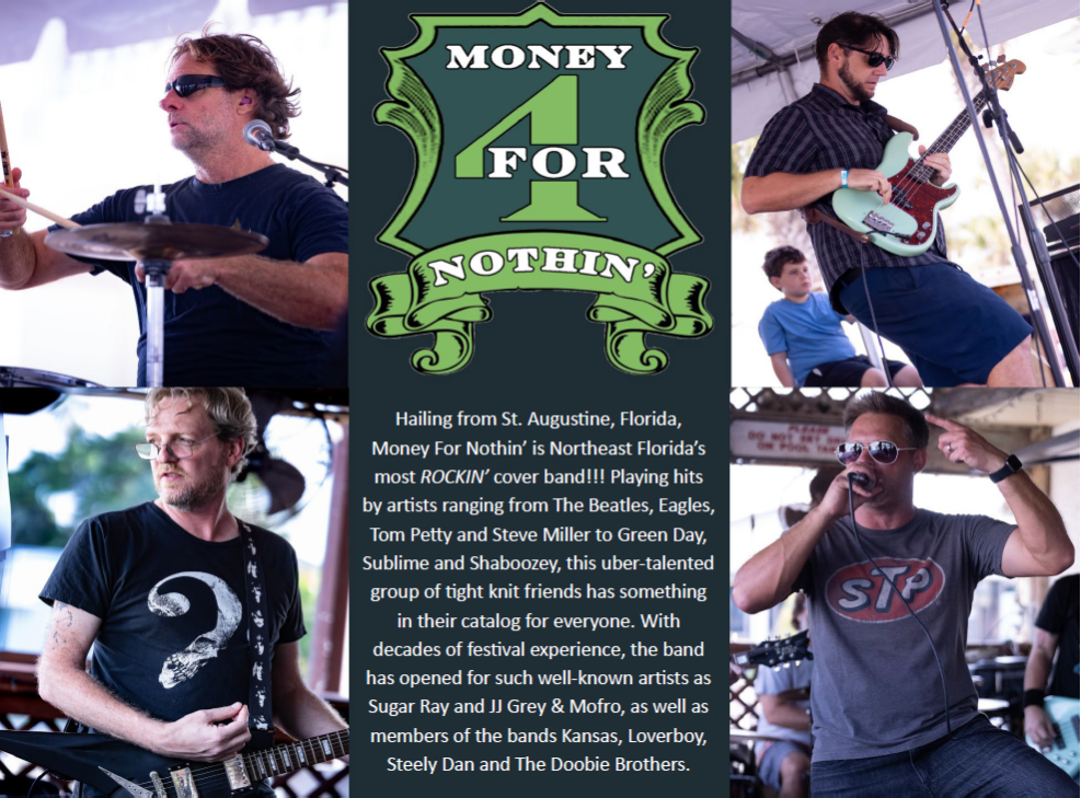 Hailing from St. Augustine, Florida, Money For Nothin’ is Northeast Florida’s most ROCKIN’ cover band!!! Playing hits by artists ranging from The Beatles, Eagles, Tom Petty and Steve Miller to Green Day, Sublime and Shaboozey, this uber-talented group of tight knit friends has something in their catalog for everyone. With decades of festival experience, the band has opened for such well-known artists as Sugar Ray and JJ Grey & Mofro, as well as members of the bands Kansas, Loverboy, Steely Dan, and The Doobie Brothers.